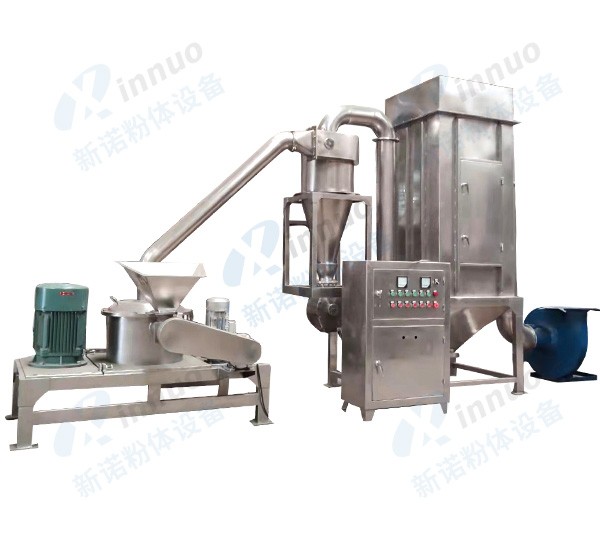 物料由料斗经螺旋输送器进入粉碎室,被高速旋转的刀片剪切粉碎,通过负压风运的方法把物料运入旋风分离器,袋式除尘器、排出物料达到产品的要求。