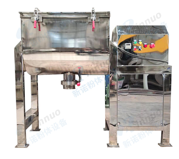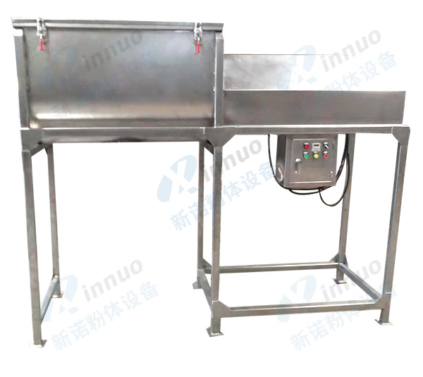 该机由混合槽、螺旋搅拌叶片和传动部件等组合而成,螺旋叶片一般做成二层,外层螺旋将物料从两侧向汇集,内层螺旋将物料从向两侧分流,使物料在混合槽内形成对流混台,从而达到高均匀度混合。